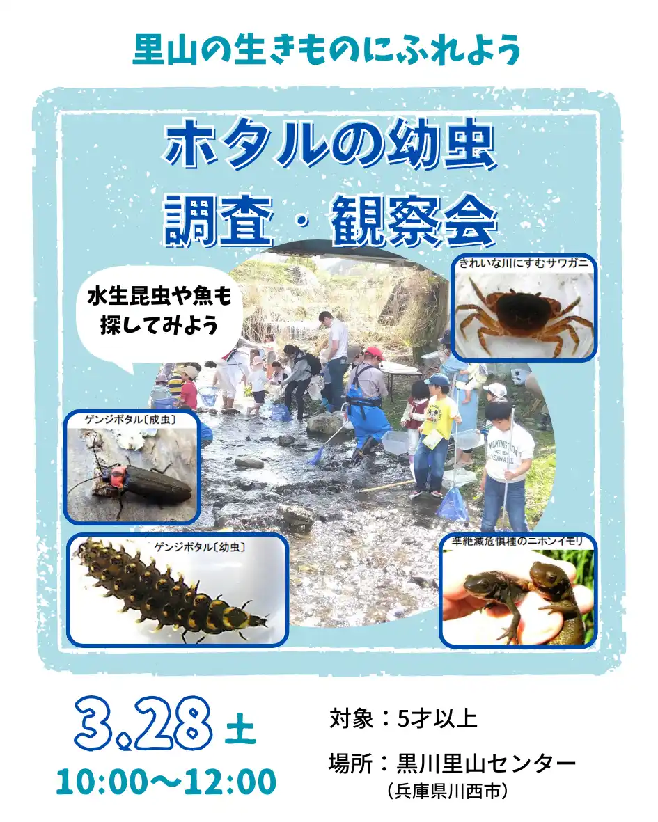 兵庫県川西市黒川にある 黒川里山センターでは、2026年3月28日(土)、里山の生きものを観察するイベント「ホタルの幼虫調査・観察会」を開催します。 |