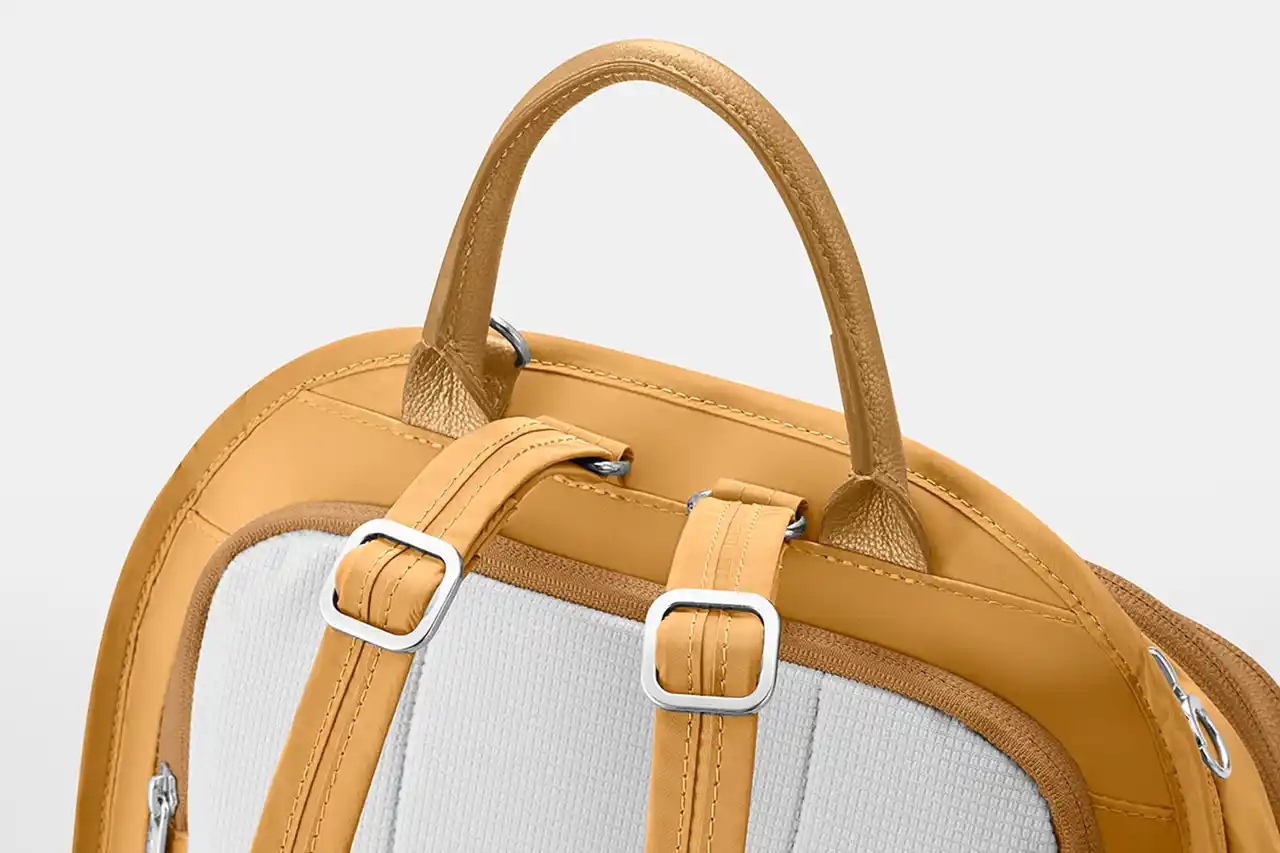 持ち運びに便利な牛革のトップハンドルを備えます。 |