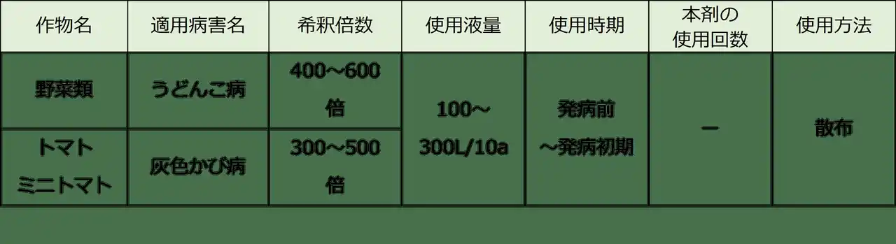 また、有効成分であるBLADは、食品衛生法で「人の健康を損なうおそれのないことが明らかな物質(対象外物質)」とされており、残留基準値の設定が不要で、使用回数の制限がありません。農林水産省が持続可能な食料システム構築に向けて策定し、化学農薬の低減を盛り込んだ「みどりの食料システム戦略」にも適合する製品として期待されます。 |
