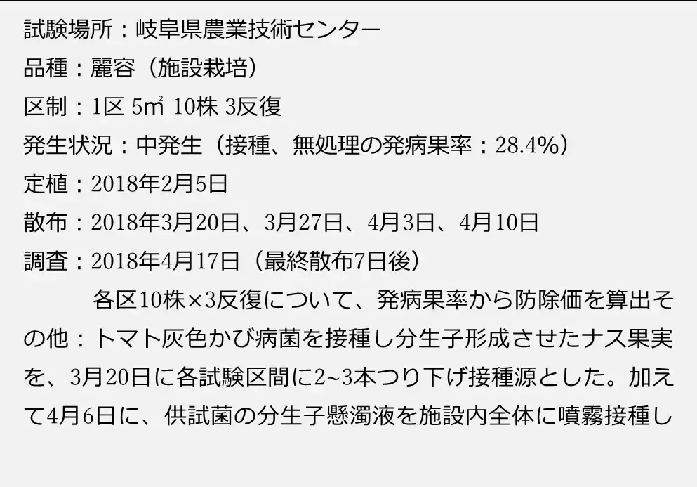 プロブラッド(R)液剤のトマト灰色かび病に対する効果 |