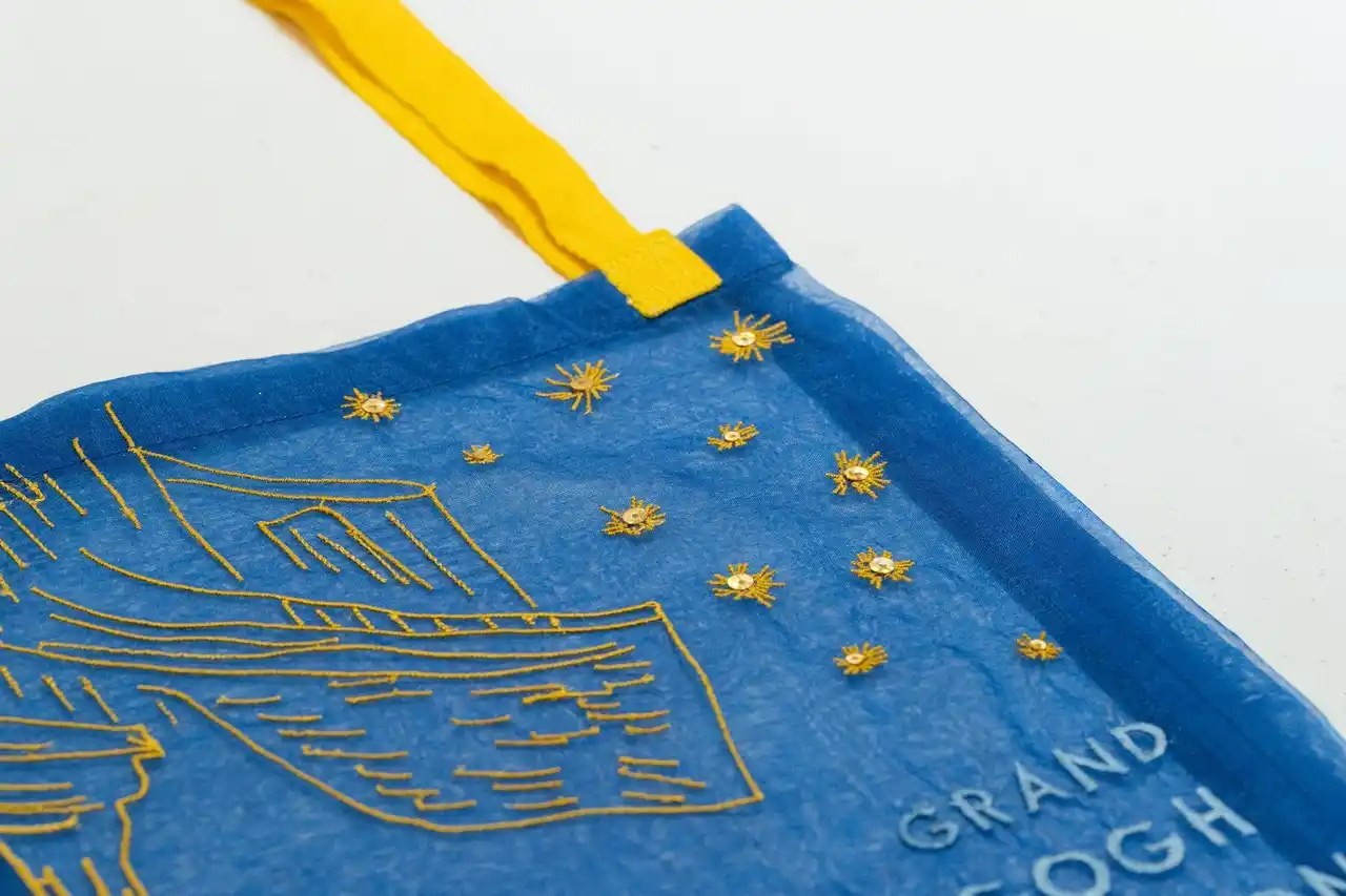 ファン・ゴッホ《夜のカフェテラス》をイメージして、オーガンジー素材で澄んだ夜空を、黄色い糸の刺繍で温かい光が漏れるカフェテラスを再現しました。きらめく夜空の星はスパンコールで表現した、東京展限定グッズです。本スペシャルチケットには黄色い持ち手の限定色バッグが付属します。 |