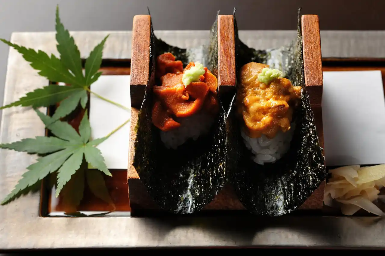 | 壱岐リトリート 海里村上では、壱岐の海の幸を中心に、料理長が季節ごとの素材を活かした会席料理を提供しています。九州産赤ウニと北海道産ウニは、お造りや手巻き寿司、温物、さらに海里村上名物料理「海里焼き」と、さまざまな調理法でご提供。二種類のウニの個性の違いを、一皿ごとに楽しめる構成となっています。 | |||||||||||||