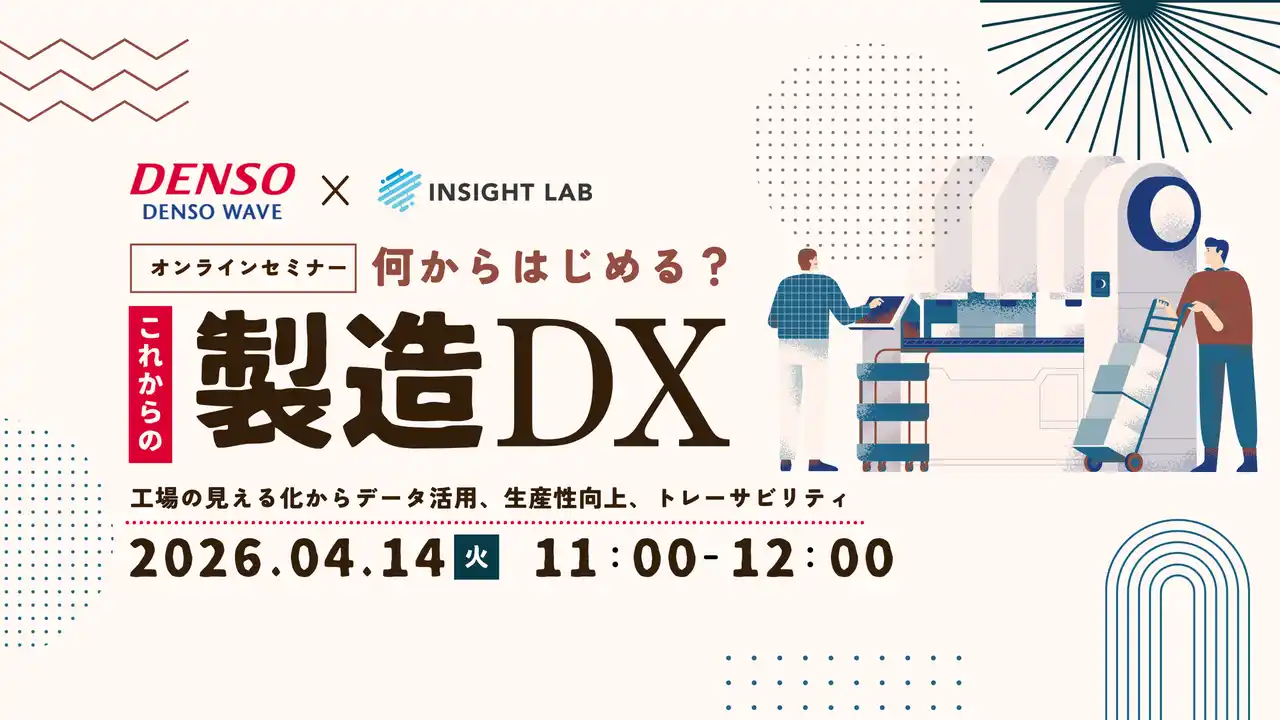 INSIGHT LAB株式会社(本社:東京都新宿区、代表取締役社長 CEO:遠山 功、証券コード:227A、以下「当社」)は、株式会社デンソーウェーブ(本社:愛知県知多郡阿久比町、代表取締役社長:相良隆義、以下「デンソーウェーブ」)との共催で、製造業向けオンラインセミナー「何からはじめる?これからの製造DX ― 工場の見える化からデータ活用、生産性向上、トレーサビリティ」を、2026年4月14日(火)11時に開催いたします。