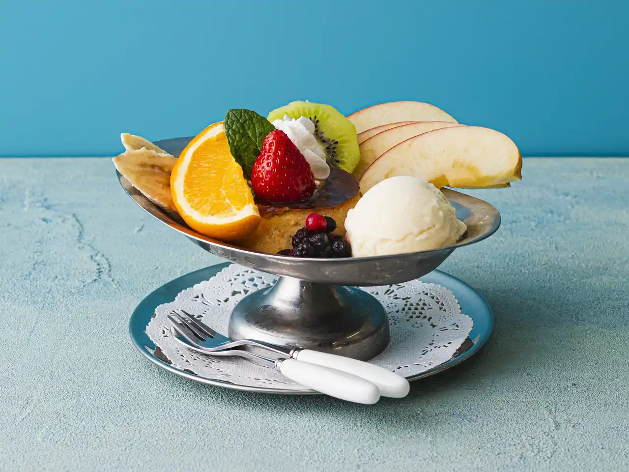 自家製プリンを主役に、バニラアイスと彩り豊かなフルーツをたっぷりと盛り付けた人気デザートです。固めのクラシックプリンは甘さ控えめ。そこに、いちご・りんご・オレンジ・バナナ・キウイ・ベリーのフレッシュな風味が広がり、どこか懐かしくも華やかな一皿です。 |
