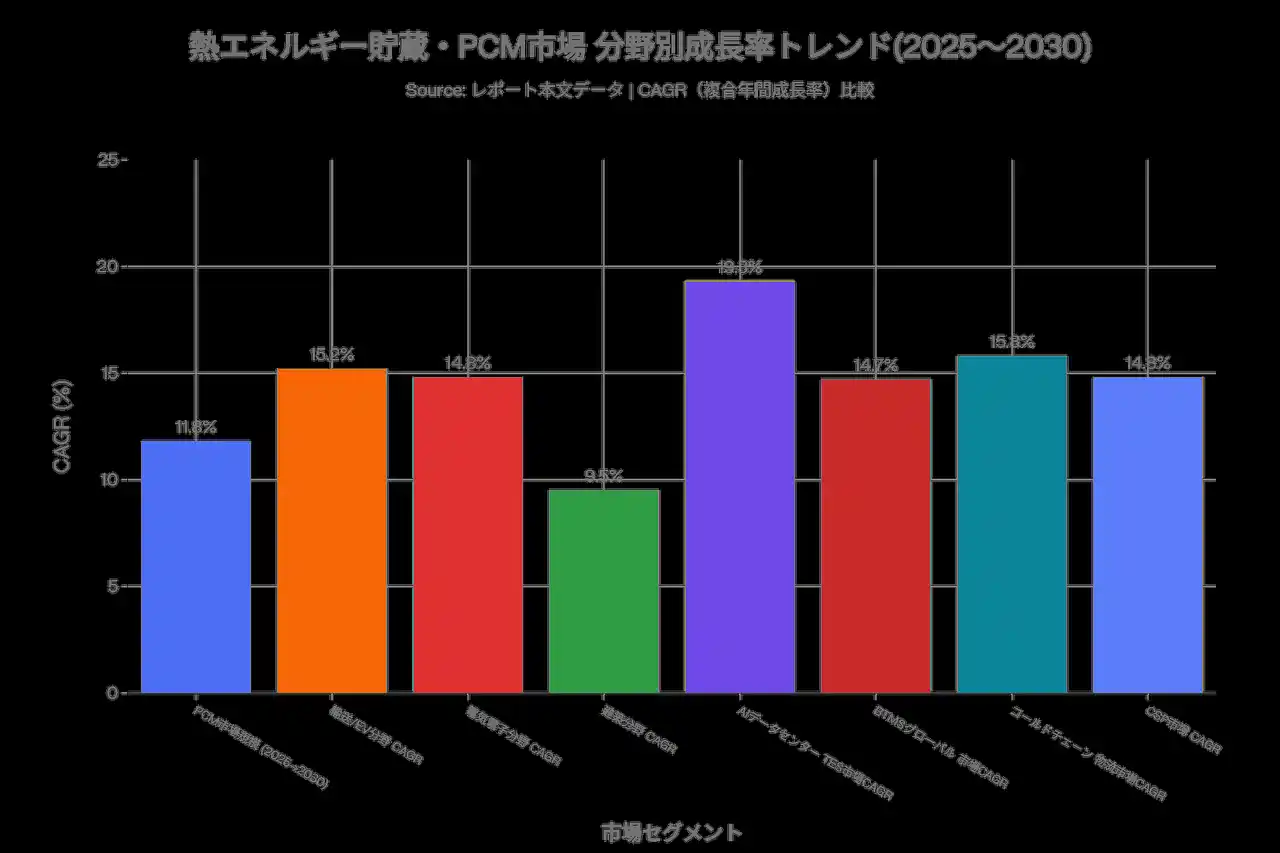 世界PCM市場は2025年時点で約72億米ドルと推定され、2030年までに140億米ドル超への拡大が見込まれる(CAGR約11.8%) |