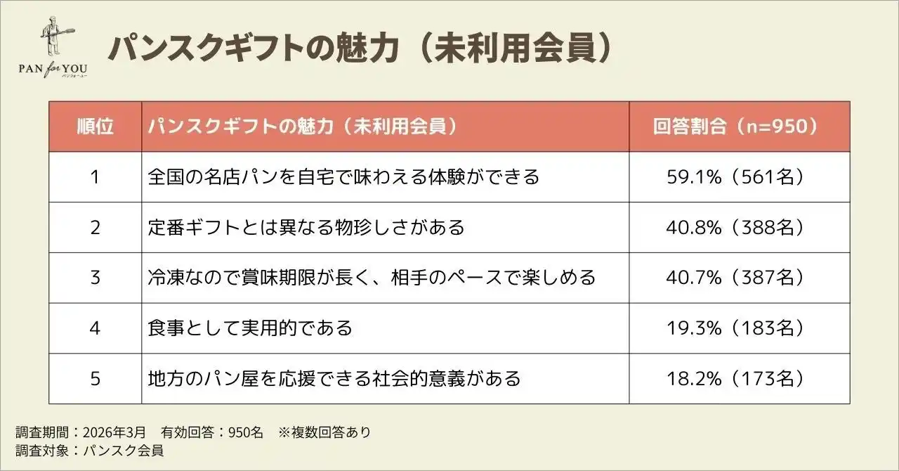パンスクギフトを利用したことがないパンスク会員950名に対し、「全国各地のパン屋から冷凍パンが届くギフト」としてパンスクギフトを紹介したところ、「とても興味がある」(29.6%)と「やや興味がある」(41.4%)を合わせた70.9%(674名)が肯定的な反応を示しました。また、最も魅力を感じる点として「全国の名店パンを自宅で味わえる体験ができる」(59.1%)が首位となり、体験型消費へのニーズの高さが確認されました。 |