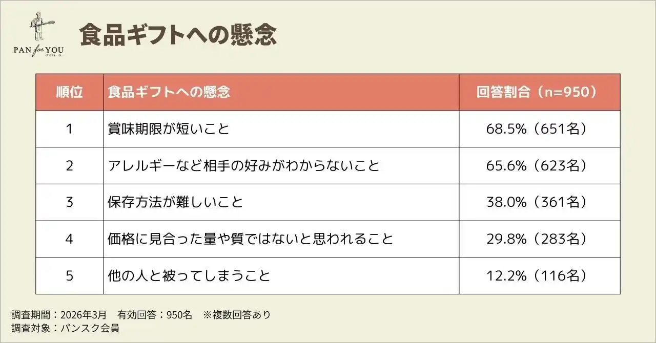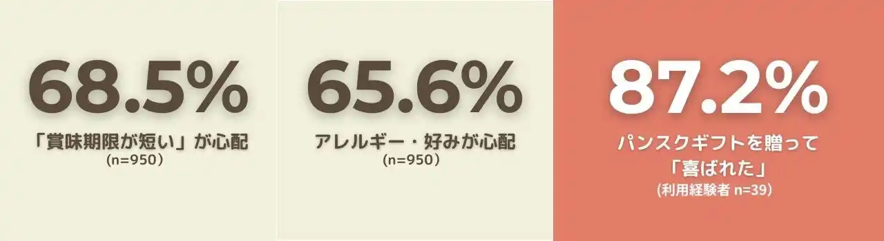 全国各地のパン屋さんの冷凍パンを自宅に届けるサービス「パンスク」を運営する株式会社パンフォーユー(本社:群馬県桐生市、代表取締役:矢野健太)は、パンスク会員を対象に「歓送迎会ギフトに関する意識調査」を実施しました。本調査では、食品ギフトを選ぶ際の2大障壁が明確となるとともに、全国の名店パンを冷凍でお届けする「パンスクギフト(https://gift.pansuku.com/)」が、その課題を同時に解決しうる新しい歓送迎会ギフトとして注目を集めていることが分かりました。 |