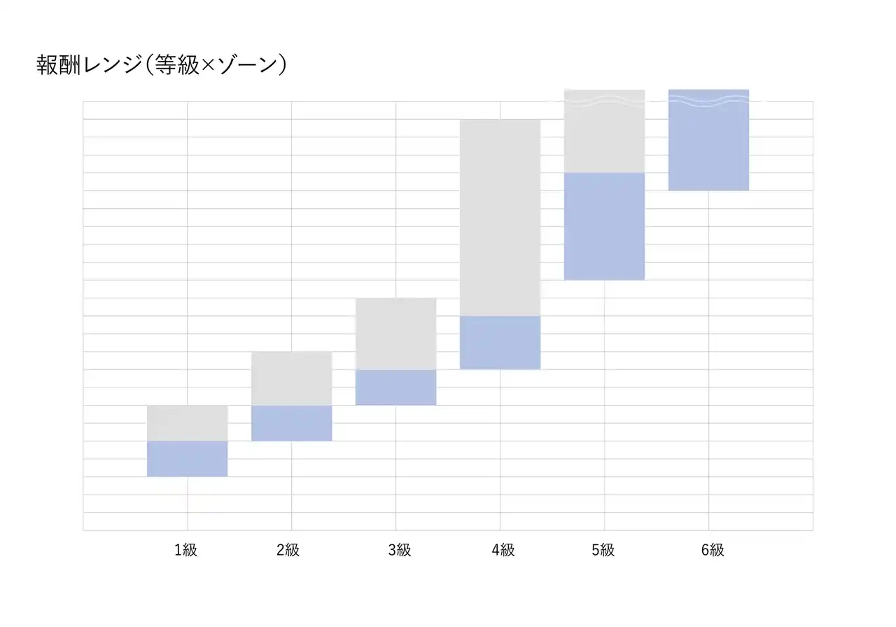 従来の管理職を目指すことが昇給の前提となるピラミッド型組織の概念を脱却。等級を6段階に分割し、報酬レンジを幅広く設定することで、現場で専門性を磨き続けるプロフェッショナルも、そのスキルの進化を即座に処遇へと反映できる仕組みを実現しました。 |
