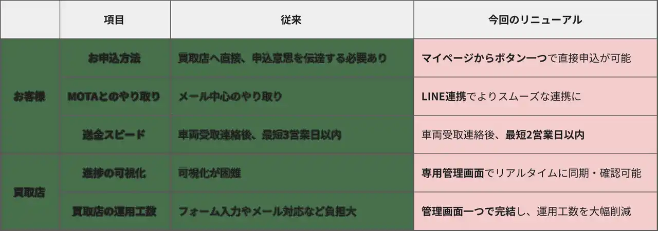 MOTAは今後も「あんしん決済」のさらなる利便性向上を目指し、全体の期間短縮や作業効率の向上、使い勝手の改善を追求していきます。引き続き、お客様と買取店がフェアに、かつ安心して取引できる中古車流通プラットフォームの構築を牽引してまいります。 |