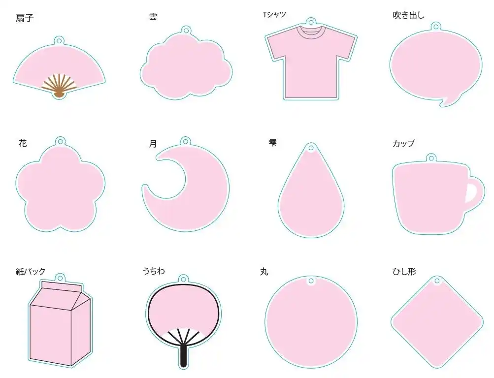 | オリジナルグッズプレスでは、アクキー製作におけるデータ作成・入稿の負担を軽くするため、形状設計済みのテンプレートを提供しています。今回、公式グッズや推し活で使用頻度の高いモチーフを中心に、以下12種の形状テンプレートを新規投入しました。 | ||||||||||||