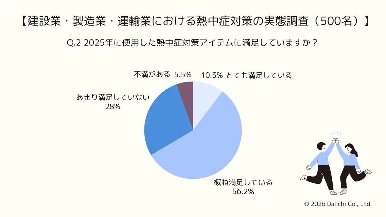 調査の結果、79.4%が「熱中症対策は必要」と回答しました。一方で、2025年に使用した対策アイテムについて「満足」と回答した割合は66.5%にとどまり、33.5%が十分ではないと感じていることが明らかになりました。猛暑の常態化が進む中、労働安全衛生法に基づく安全配慮義務の重要性は年々高まっています。企業には従業員の健康被害を未然に防ぐ体制整備が求められており、形式的な対策では不十分な時代に入りつつあります。 |