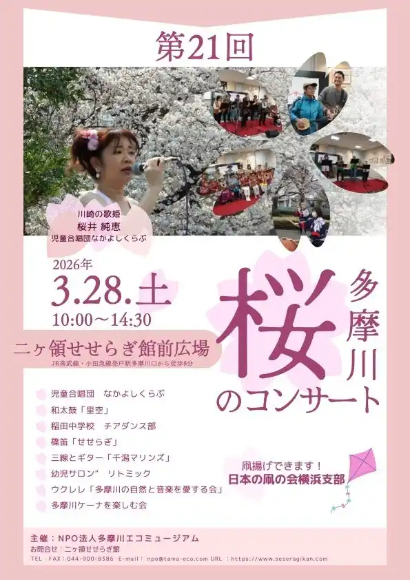 日程 : 令和8年3月29日(日) 10:00~15:00 場所 : 二ヶ領用水沿いの村山商会前から一本圦橋 問合せ先 :台和桜まつり実行委員会 木澤静雄 090-3224-3352(9:00~19:00) |