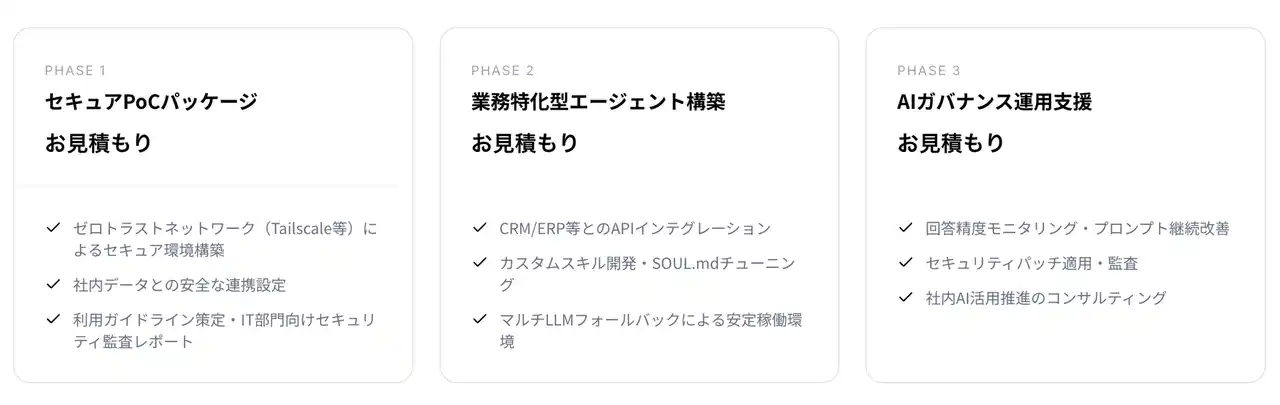 | 本サービスは、OpenClawの環境構築からセキュリティ対策、ガバナンス支援まで、法人導入に必要なすべてのプロセスをワンストップで提供するサービスです。 | |||||||||||||||