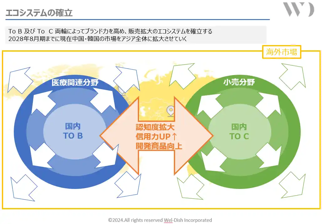 食品・ウェルネス・メディカルコスメを軸とした既存事業に、医療・介護・社会福祉分野の周辺事業を組み合わせることで、ブランド力・販売力・財務基盤の強化を同時に実現するエコシステムの構築を目指します。 |