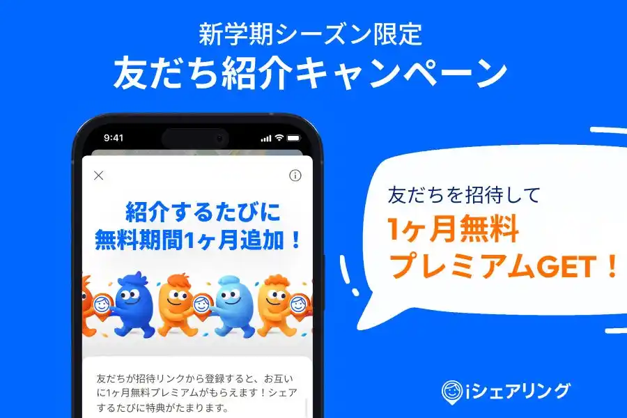 iシェアリングでは、新学期シーズンに合わせて友だち紹介キャンペーンを実施します。友人や家族が招待リンクからアプリに登録すると、紹介したユーザーと招待されたユーザーの双方がプレミアム機能を1か月間無料で利用できます。 |