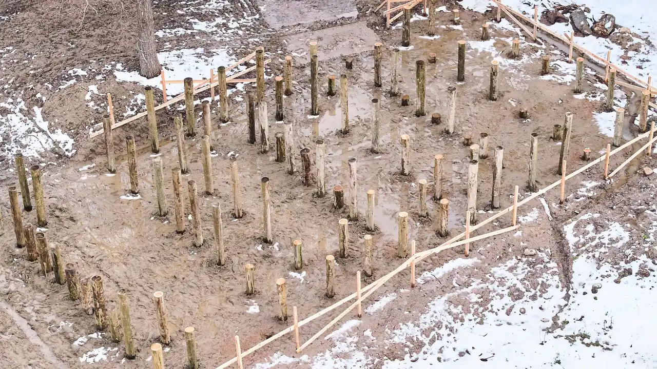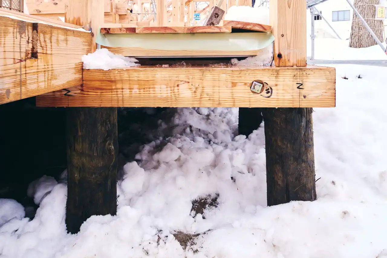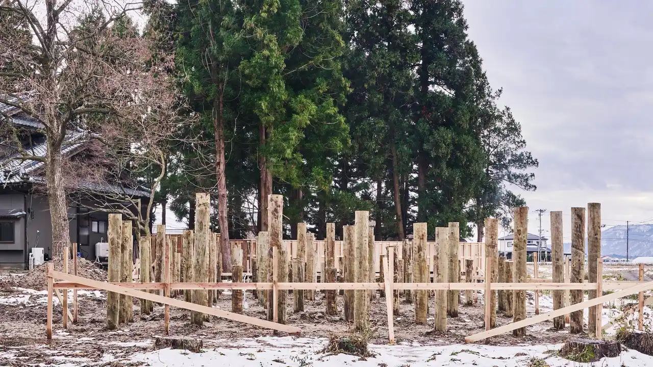 本建築では、地元で採取可能な木材と土のみを使用しています。基礎構造には木杭(きぐい)を採用しており、建築全体においてコンクリートは一切使用していません。この構法は、日本の伝統的な建築技術を現代のホスピタリティ建築に継承する試みの一つでもあります。 |