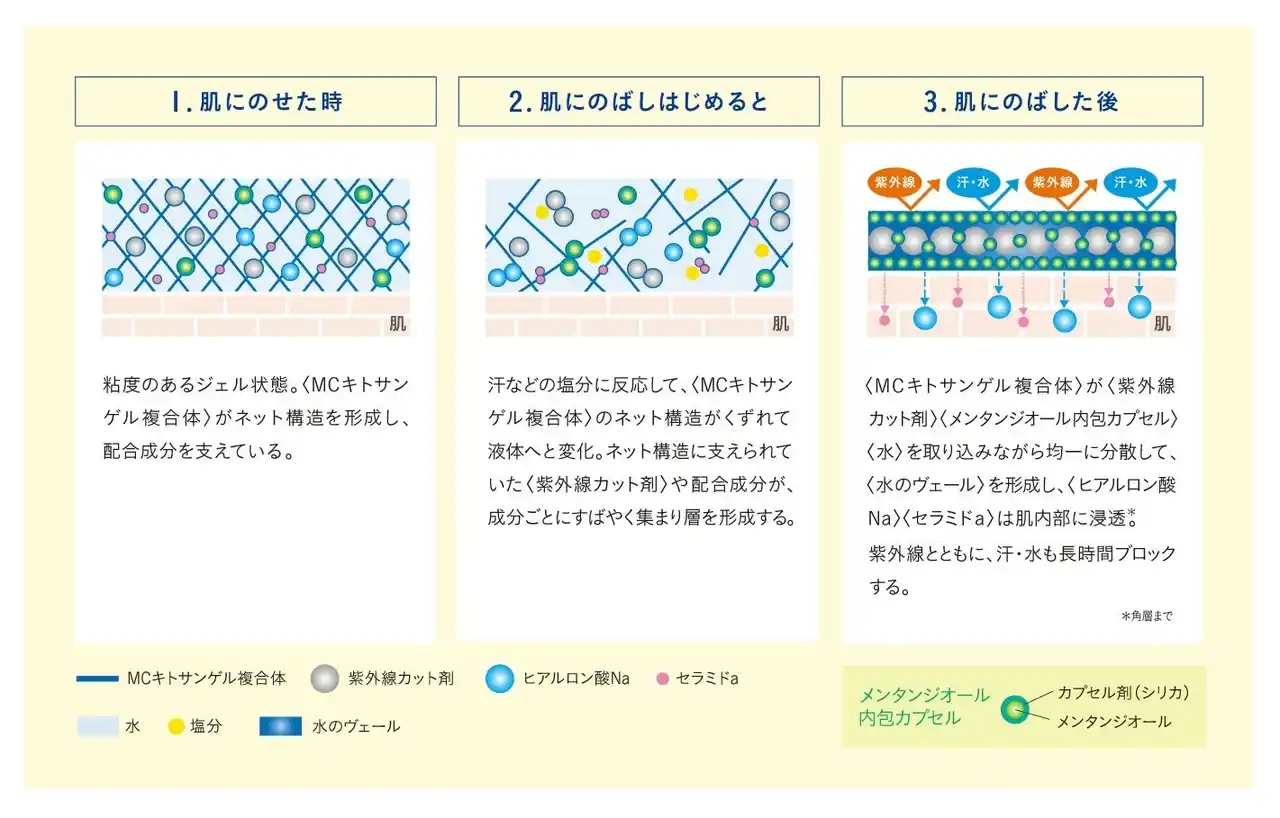 | ・肌表面の汗などの塩分に触れると<MCキトサンゲル複合体(※14)>がくずれて、水分や油分に強い<水のヴェール>に変化。保湿成分<MCキトサン(※15)>は、角層に吸着するため、潤いを保ちます。 | |||