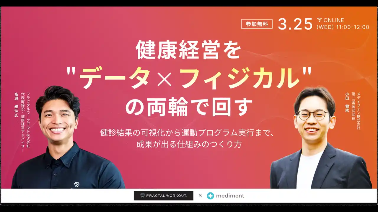 | 本セミナーでは、メディフォン株式会社が担う健康管理基盤の整備と、フラクタルワークアウト株式会社が担う運動施策の設計・実行支援を接続し、把握だけで終わらない健康経営の進め方を提示します。 | |||||||||||||