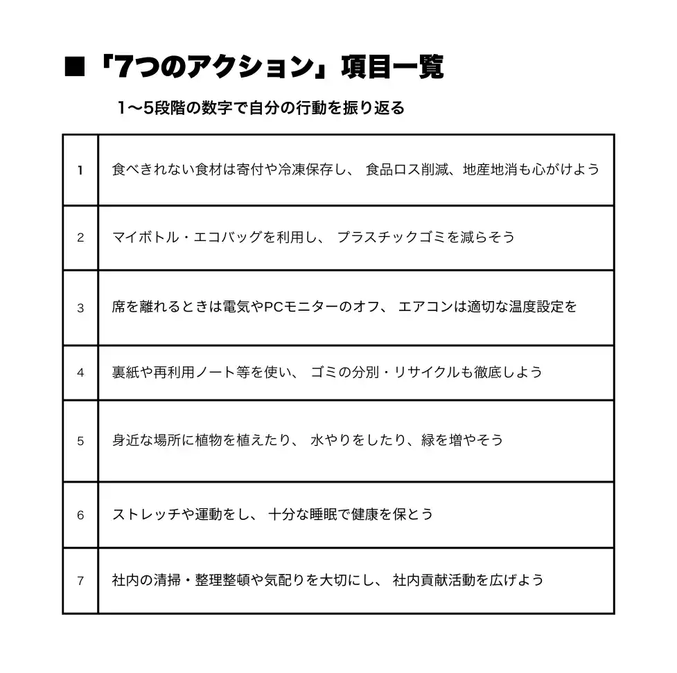 | 節電や食品ロス削減、プラスチックごみ削減など、日常業務の中で実践できる行動を社員全体で意識する取り組みです。 | |||||||||