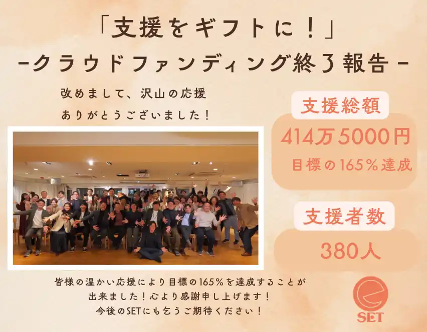クラウドファンディング最終日は、SETの15周年の誕生日でもありました。 これまで応援してくださった皆さまとともに、次の15年に向けて新しい挑戦を続けていきたいと思います。 |