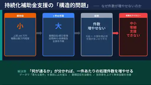 持続化補助金は、小規模事業者の販路拡大を支える重要な国の制度です。しかし、支援が必要な小規模事業者ほど、コンサルのサポートを受けられないという構造的な問題が存在します。 |