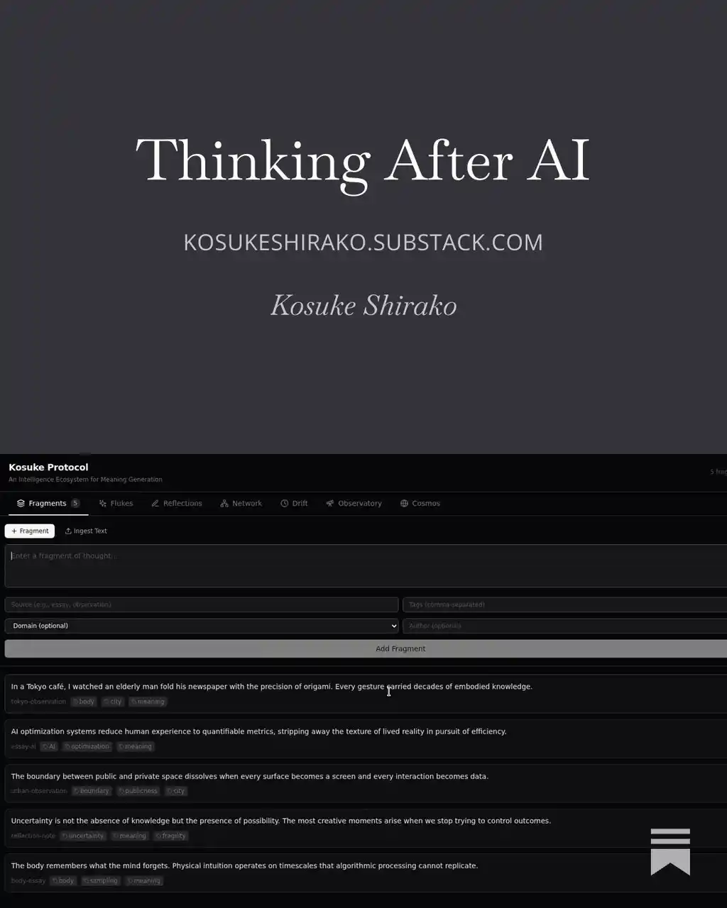 Kosuke Protocolは、この変化を背景に、人間の思考の役割を再考するためのコンセプトとして公開されました。 |