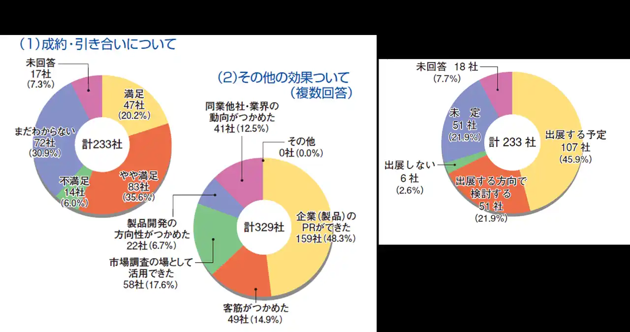 出品者アンケートでは、55.8%が商談実績に「満足・やや満足」と回答しており、モバックショウが商談実績の高い展示会として評価されていることを裏付けています。また、次回出展についても、「出展予定」107社(45.9%)、「出展の方向で検討」51社(21.9%)となり、従来どおり高い支持をいただいております。 |