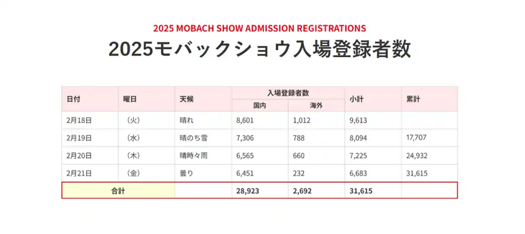 2025モバックショウに出品した企業が2027モバックショウに連続して出品していただいた場合、1小間につき10,000円割引となります。 |