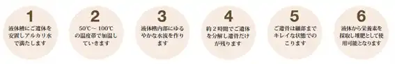 アクアメーションは、水とアルカリ溶液、適切な温度・圧力管理のもとで有機物を分解する技術です。装置の液体層に個体の大きさに合わせたアルカリ水を注入し、緩やかな水流を加えながら50℃以上に加温していきます。個体の大きさにより施行時間は異なりますが、約1~2時間ほどで完了します。 |