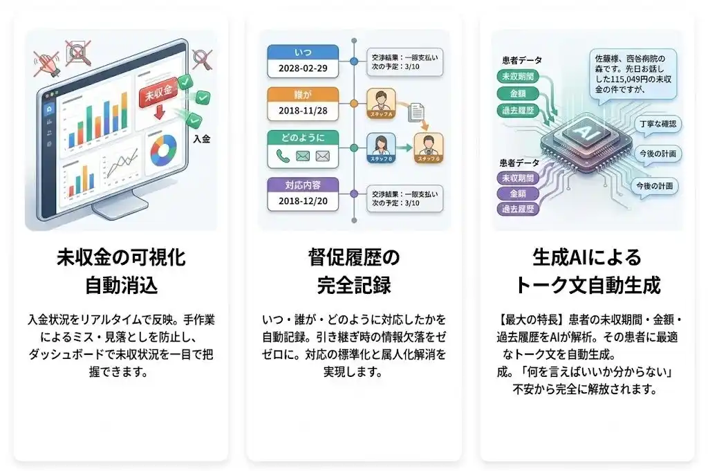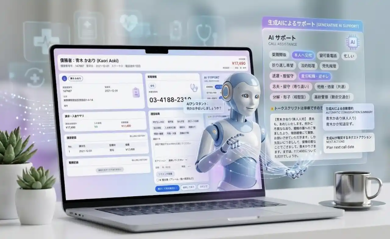| 未収金回収業務の最大のネックである「電話督促」を生成AIがフルサポート。患者属性・過去履歴に基づく最適トークスクリプトを自動生成し、担当者は画面読み上げだけでOK。 | |||||||||||||||||||||||||||