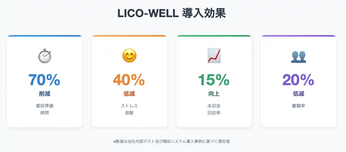 | 医療機関こそ、率先して健康経営を実践すべき場所だと考えています。患者さんの健康を支える人たちが、自分自身の健康を犠牲にしてはいけない。LICO-WELLの導入は、医療機関における債権回収の効率化だけでなく、職員の笑顔を守り、組織の活力を引き出す健康経営の重要な一手となります。」 | |||||||||||||||||||||||||||