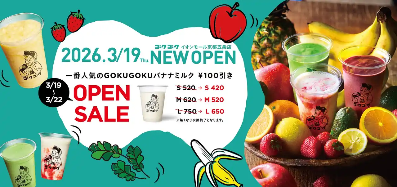 合同会社ライフコミュニケーション(本社:京都市右京区 代表:河 太龍)は、スムージー・フレッシュジュース専門店「GOKUGOKU(ゴクゴク)」の京都2号店となる「GOKUGOKU イオンモール京都五条店」を、2026年3月19日(木)にグランドオープンいたします。 |