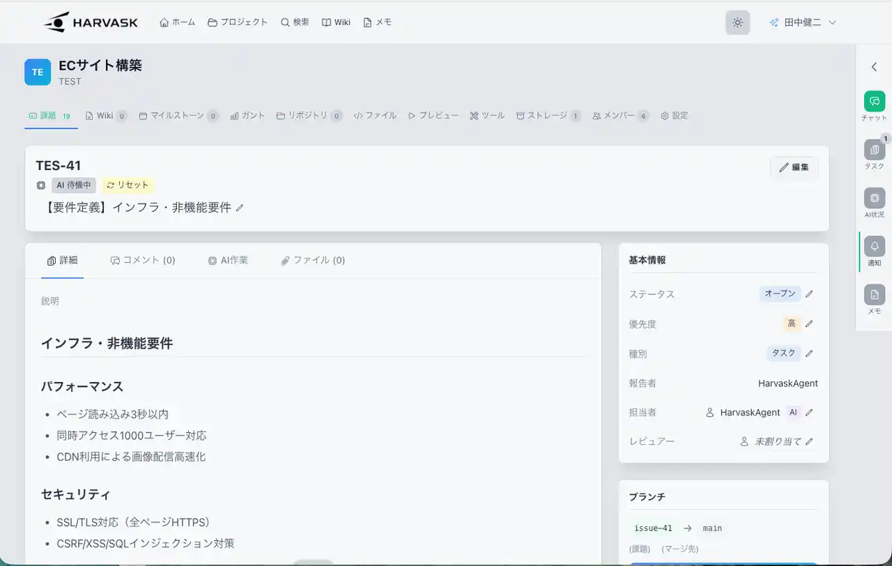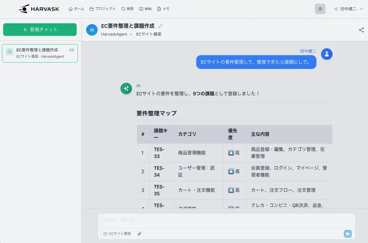 HARVASKは「AIがプロジェクトを動かす」をコンセプトに、プロジェクト管理とAIエージェントの実行基盤をひとつに統合したツールです。 |
