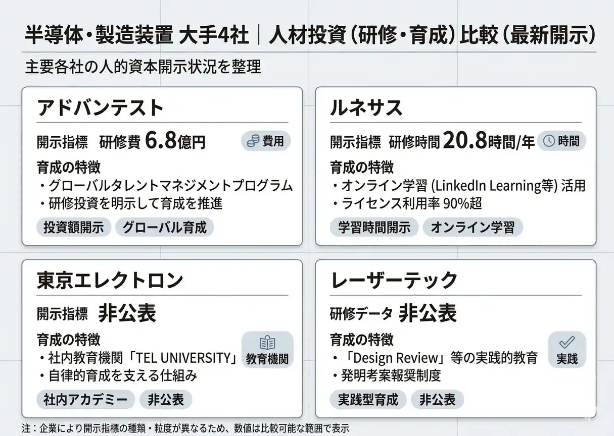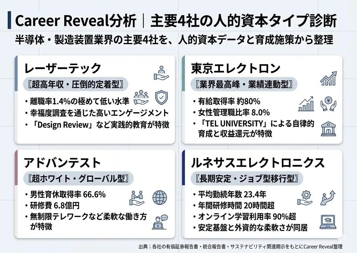 | 株式会社エフペリが運営する、人的資本データのオープンインフラ「Career Reveal(キャリア・リビール)」は、半導体・製造装置業界の主要4社(東京エレクトロン、レーザーテック、アドバンテスト、ルネサスエレクトロニクス)について、有価証券報告書・統合報告書・サステナビリティレポート等の一次情報をもとに、人的資本(研修・育成・多様性)に関するKPIを横断比較し、ランキング形式で可視化しました。 | ||||||||||||