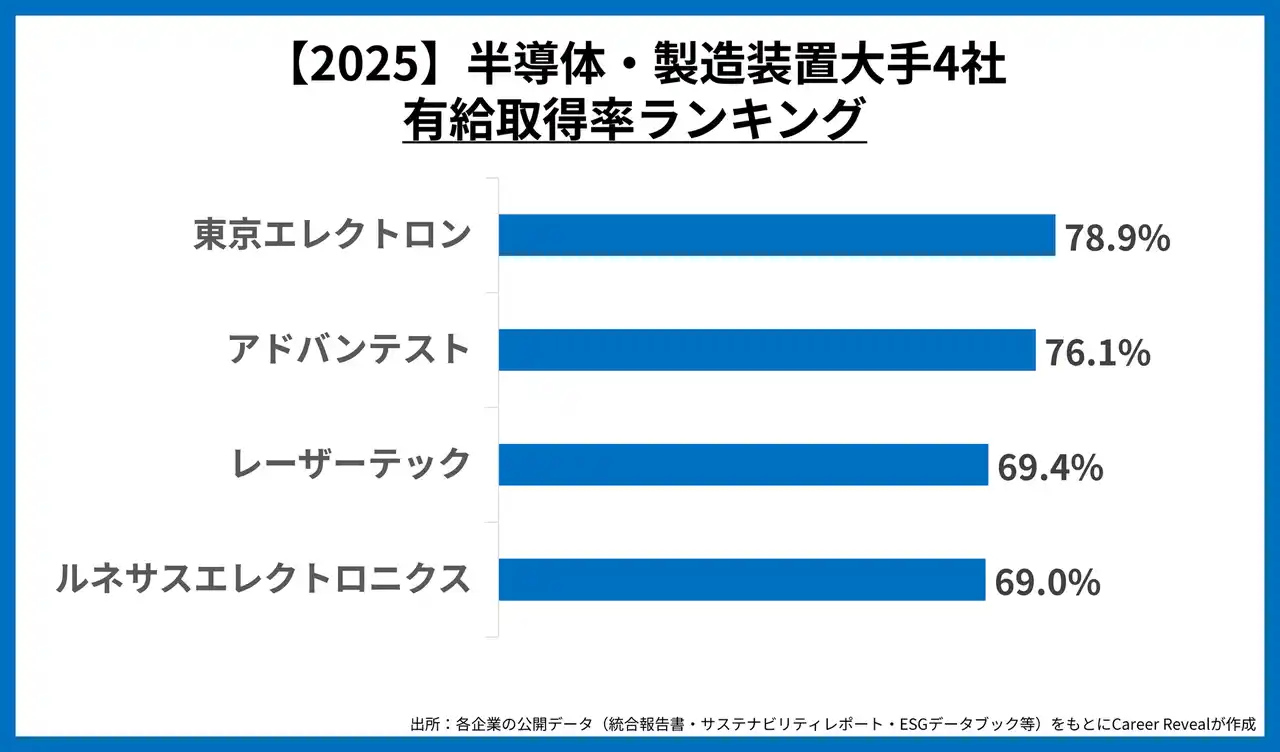 | 東京エレクトロンとアドバンテストが平均を上回り「休みやすさ」が際立つ一方、レーザーテックとルネサスも約70%の高水準を維持しており、業界全体として良好なワークライフバランスが保たれていると整理されます。 | ||||||||||||
