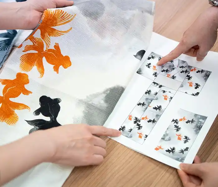 「夏を感じる柄」とは具体的に何か。それを形にするため、スタッフ自身の思い出や「こんなデザインを作りたい!」というアイディアを出し合いました。強い思いを形にするために、下絵をデザイナー自ら描いたものも。最終的に京都の図案家さんの手によって仕上げられ、個性豊かでストーリーを感じさせる魅力的なデザインが誕生しました。 |