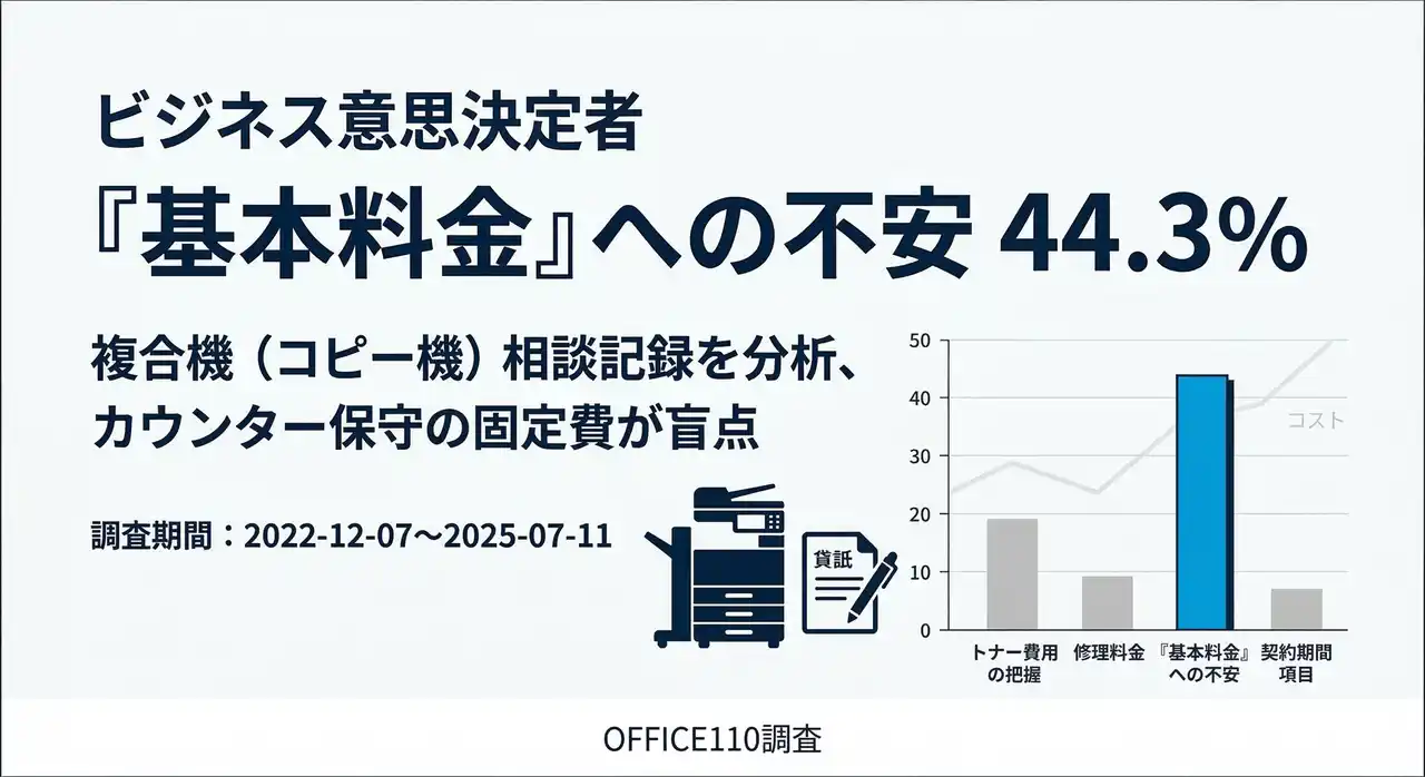 複合機(コピー機)の見積もりでは、モノクロ単価やカラー単価が比較軸として注目されやすい一方、カウンター保守における 「基本料金」 や 「最低利用料金」 などの固定費項目は、比較時に十分に理解されないまま検討される傾向があります。 OFFICE110 は、現場で蓄積された相談記録をもとに、固定費に関する不安の実態を調査しました。 |