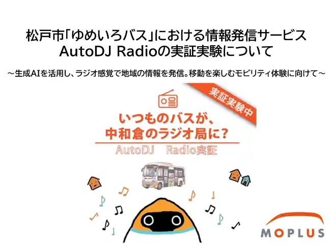 Moplus 株式会社(本社:東京都千代田区、代表取締役 CEO:柳瀬賢、同 COO:中川和明)は、 3月16日より千葉県松戸市(市長:松戸隆政)の運営する松戸市「ゆめいろバス(中和倉コース)」の 運行中に、日産自動車の生成AIを活用した車載エージェントシステム「AutoDJ」の技術を採用した 情報発信サービス実証を実施いたします。 |