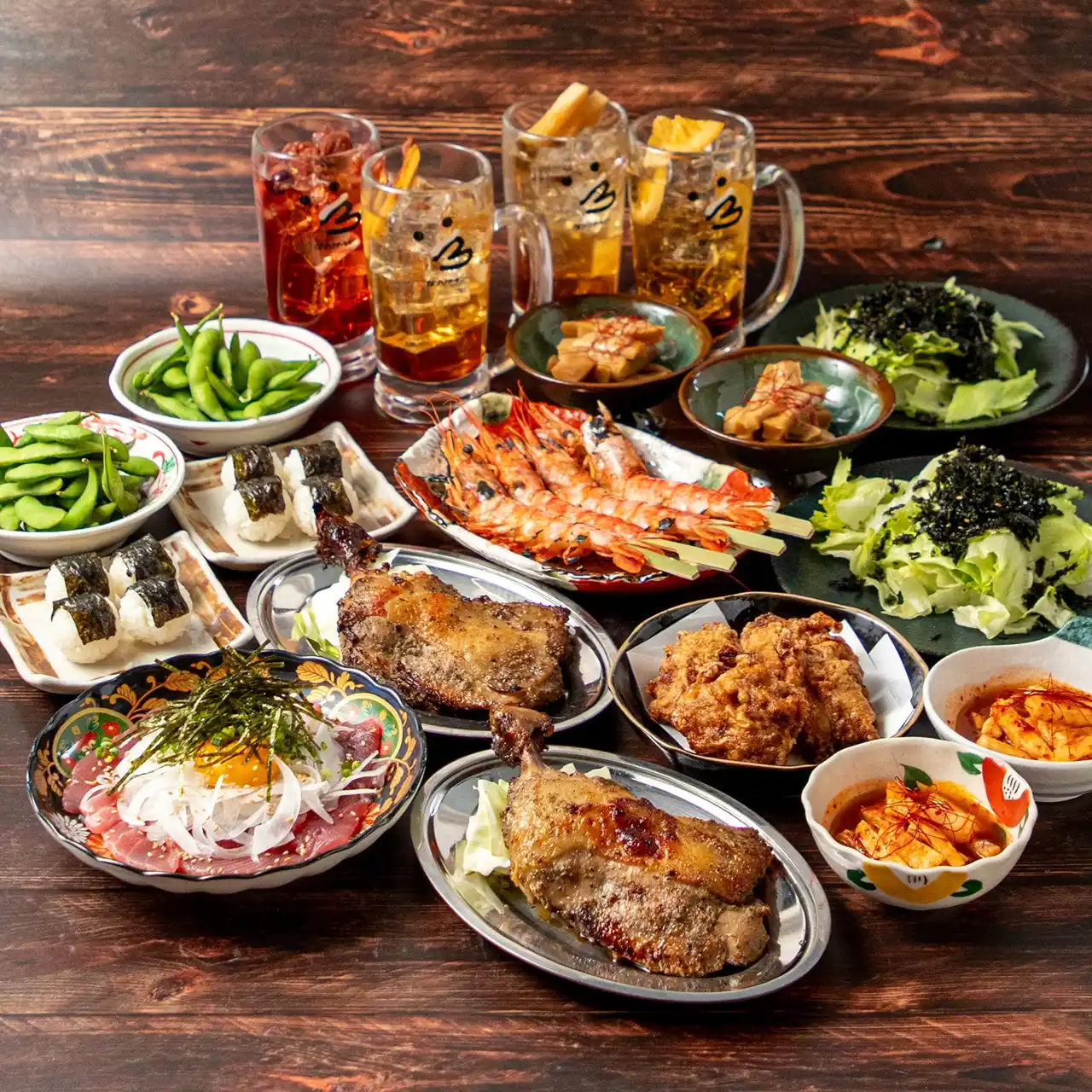 枝豆、旨味 メンマ、山芋キムチ、チョレギサラダ、ユッケ風 鮪の葱まみれ、からあげ もも、からあげ 塩麹むね、赤海老、骨付鳥 ひな鳥、骨付鳥専用おむすび |