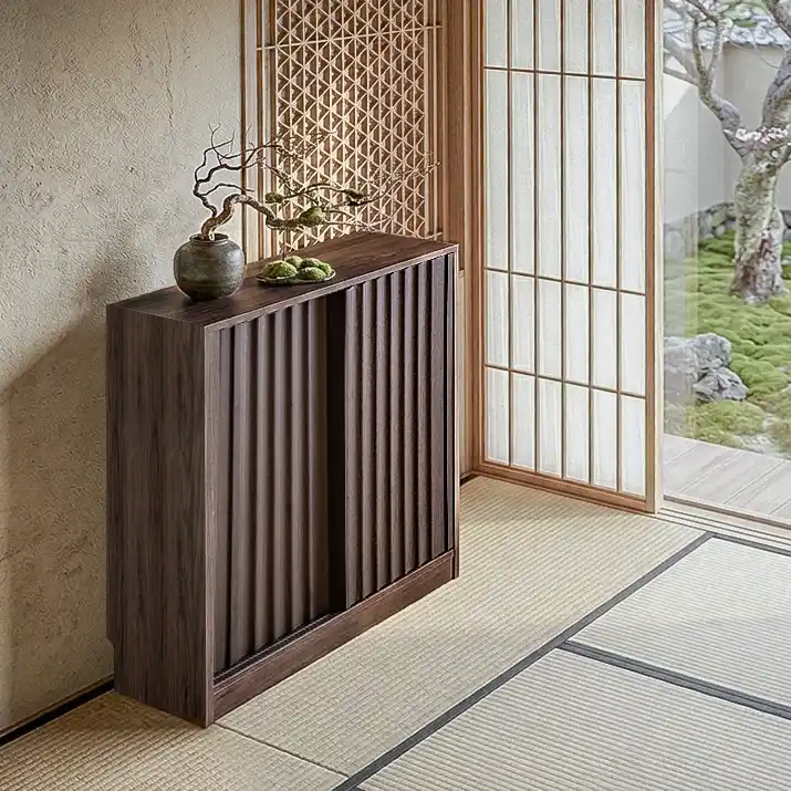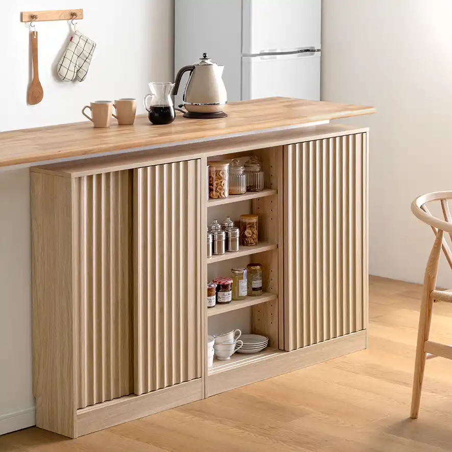 この薄型設計により、ダイニングの通路幅を確保しつつ、日常生活の動線を邪魔することなく効率的な収納スペースを創出します。 |