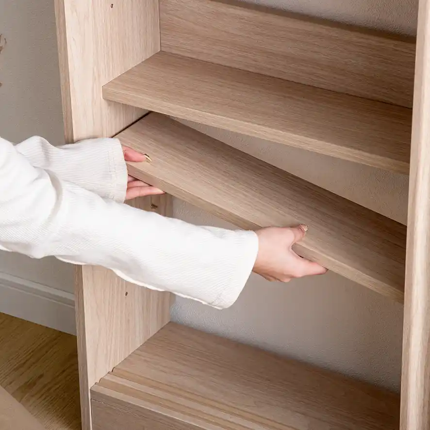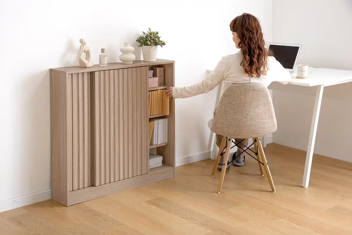 本製品は、通路を妨げない最小奥行15cmの超スリム設計でありながら、陰影が映える「波状デザイン」や、インテリアに馴染む「北欧風ツートンカラー」など、高いデザイン性を備えているのが特徴です。機能面では、収納物に合わせて高さを調節できる「7段階可動棚」を採用し、散らかりがちな文房具や書類、日用品を「隠す収納」ですっきりと整理いただけます。 |