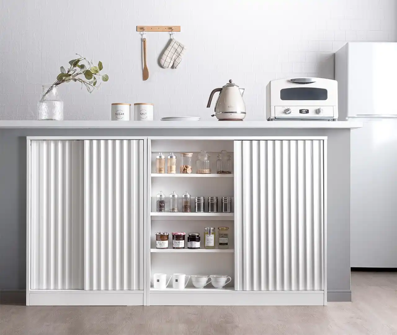 波状デザインなどの高い意匠性を持つ扉を採用することで、整理が苦手な方でも、扉を閉めるだけで美しい空間を保てます。 |