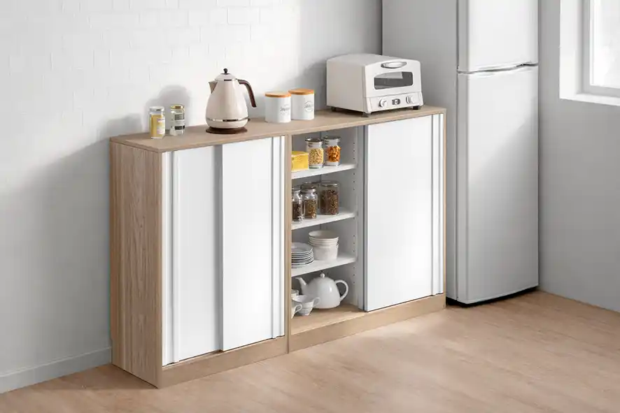 キッチン本体の収納だけでは足りない場合の「第二のパントリー」として、効率的な家事をサポートします。食品・日用品のストック: キッチンペーパーやラップ、調味料の瓶、お菓子などのストック品を、通路を塞がずに大量に保管できます。 |