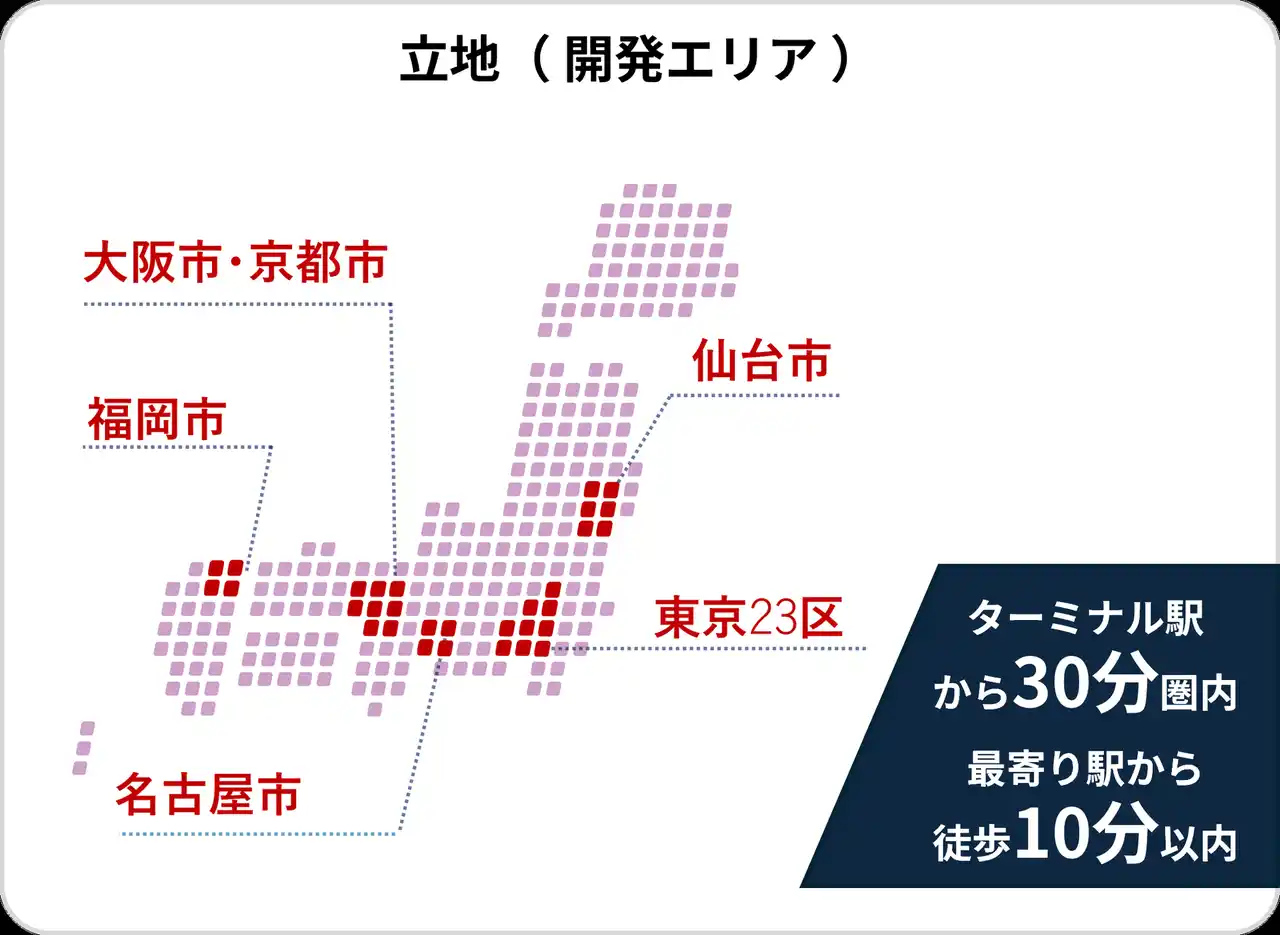 長年にわたり、将来にわたる賃貸ニーズを見込む「5大都市圏の中核都市(東京23区・関西<大阪市・京都市>・名古屋市・福岡市・仙台市)」において、「ターミナル駅から30分圏内」かつ最寄り駅から「徒歩10分以内」の土地の選定を続けております。土地価格が上昇する場面においても、この妥協なき立地選定を貫くことで、安定した稼働と資産価値の維持・向上に貢献する物件をご提供しております。 |