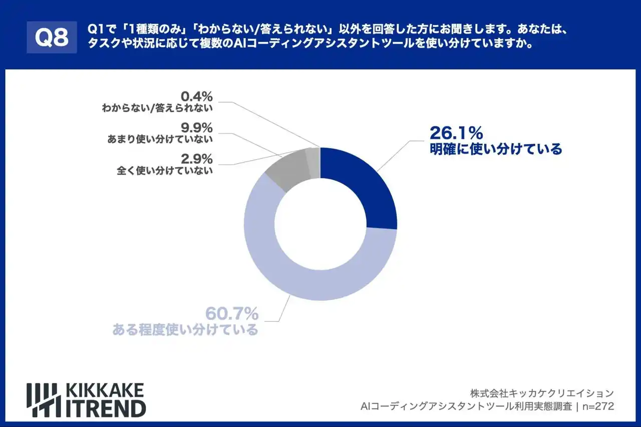 「Q8. Q1で「1種類のみ」「わからない/答えられない」以外を回答した方にお聞きします。あなたは、タスクや状況に応じて複数のAIコーディングアシスタントツールを使い分けていますか。」(n=272)と質問したところ、「明確に使い分けている」が26.1%、「ある程度使い分けている」が60.7%という回答となりました。 |