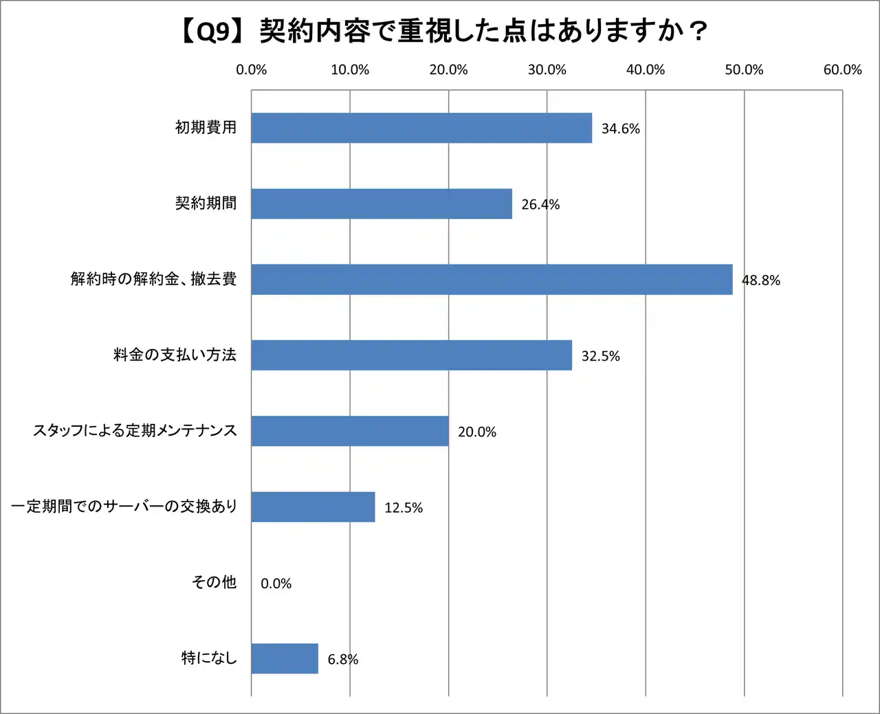 契約内容で重視した点では、「解約時の解約金・撤去費」48.8%と半分近い方が解約金や撤去費を重視しており、次いで「初期費用」が34.6%、「料金の支払い方法」が32.5%と高い割合となりました。 |