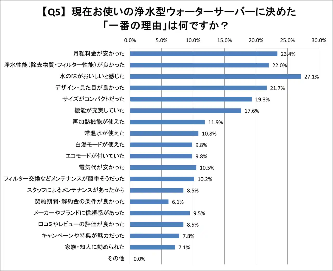 「水の味がおいしいと感じた」が27.1%と最も多く、次いで「月額料金が安かった」が23.4%、「浄水性能(除去物質・フィルター性能)が良かった」が22.0%、「デザイン・見た目が良かった」が21.3%となっています。 |