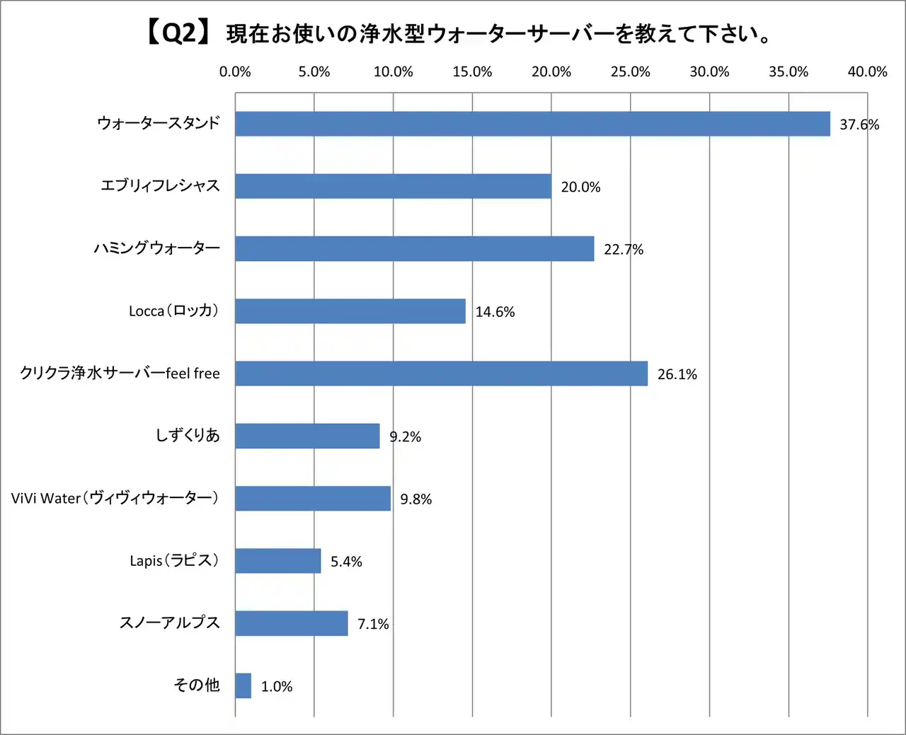 現在利用中の浄水型ウォーターサーバーでは、ウォータースタンドが37.6%と最も多く、次いでクリクラ浄水サーバーが26.1%、ハミングウォーターが22.7%、エブリィフレシャスが20%となっています。 |