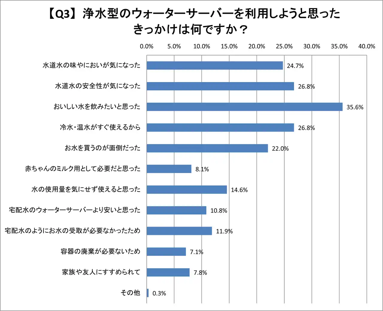 「おいしい水が飲みたいと思った」が35.6%と最も多く、次いで「水道水の安全性が気になった」、「冷水・温水がすぐ使えるから」が共に26.8%、「水道水の味やにおいが気になった」が24.7%となっています。 |