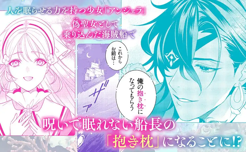 | 触れた者を眠らせてしまう力を持つニセ聖女の「アンジェラ」。呪いで眠れない船長の抱き枕になることに!? |